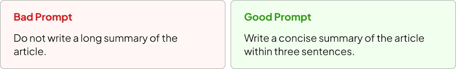 Instead of telling the AI what not to do, focus on what you want it to do. Positive instructions are easier to follow and more effective.