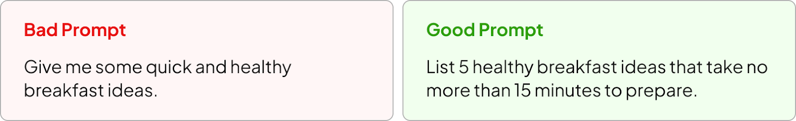 Baking a cake without a recipe? You’d probably struggle! It’s the same with AI—it works best with clear instructions. Be specific about what needs to be done, the provided input (if any), the tone you want, the level of detail, and the preferred format.
